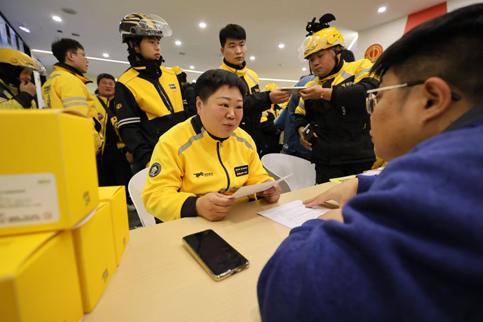 12月10日,浙江杭州,骑手向咨询服务站工作人员咨询社保缴纳问题