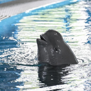 在位于湖北省武汉市的中国科学院水生生物研究所长江江豚繁育研究中心,训练员给长江江豚喂食。新华社记者 杜子璇 摄