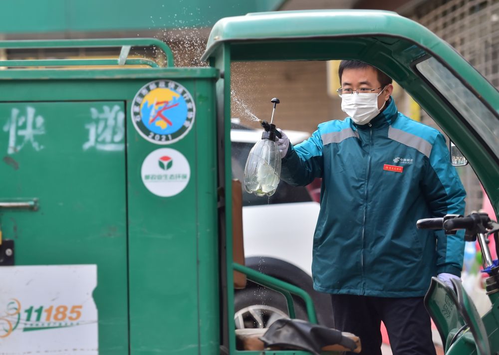 ↑1月10日,在石家莊市匯通路郵政快遞投遞部,工作人員對投遞車進(jìn)行消殺。
