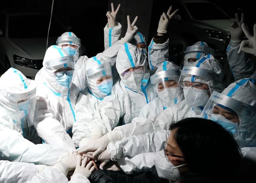↑1月7日,在石家莊市裕華區(qū)九里庭院社區(qū),醫(yī)務(wù)人員開展核酸檢測前相互加油鼓氣。