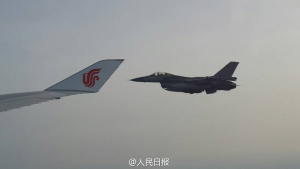 ????當習近平乘坐的專機進入比利時領空時,比利時皇家空軍兩架戰機升空護航。(圖片來源:《人民日報》法人微博)
