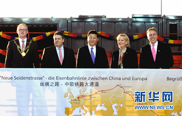 ????習(xí)近平來到火車站臺(tái)。三聲鑼響后,一列從中國(guó)重慶始發(fā)的列車滿載著貨物緩緩駛?cè)搿_@里是由重慶經(jīng)新疆跨歐亞直至歐洲的渝新歐國(guó)際鐵路聯(lián)運(yùn)大通道的終點(diǎn)。