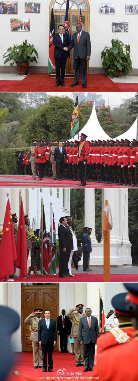????新華網(wǎng)北京5月10日電? 據(jù)新華社“新國際”微博報道,肯尼亞總統(tǒng)肯雅塔10日上午在國家宮為中國總理李克強(qiáng)舉行隆重歡迎儀式。現(xiàn)場鳴放禮炮,軍樂隊(duì)奏兩國國歌。李克強(qiáng)檢閱了儀仗隊(duì)。