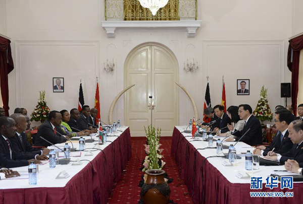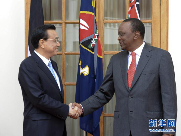 ????肯雅塔代表肯尼亞政府和人民熱烈歡迎李克強(qiáng)訪肯,表示在周恩來總理訪非50周年之際,李克強(qiáng)總理對(duì)非洲進(jìn)行的里程碑式訪問取得圓滿成功,將進(jìn)一步深化非中新型戰(zhàn)略伙伴關(guān)系。肯中有著相同的歷史遭遇和發(fā)展任務(wù),肯方感謝中方對(duì)肯經(jīng)濟(jì)社會(huì)發(fā)展和保護(hù)生態(tài)環(huán)境、野生動(dòng)物資源的幫助和支持,高度贊賞中國(guó)為維護(hù)非洲和平與發(fā)展作出的重要貢獻(xiàn),完全贊同李克強(qiáng)總理在非盟演講中提出的“461”非中合作框架和在世界經(jīng)濟(jì)論壇非洲峰會(huì)特別致辭中提出的合作建設(shè)非洲基礎(chǔ)設(shè)施“三大網(wǎng)絡(luò)”的主張,愿與中方加強(qiáng)戰(zhàn)略溝通,全面推進(jìn)各領(lǐng)域合作,實(shí)現(xiàn)共同發(fā)展。肯方愿做中國(guó)企業(yè)進(jìn)入非洲的門戶,為推動(dòng)非中合作發(fā)揮積極作用。