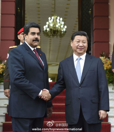 ????新華網北京7月21日電 據新華社“新國際”微博報道,習近平20日同馬杜羅總統會談時說,我們要加強頂層設計,以金融和投資為引擎,以能源合作為主軸,基礎設施建設、農業、礦業、科技合作等多個輪子一起轉,促進中委合作全方位發展。(李學仁攝)