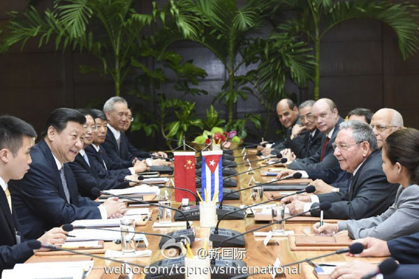 ??? 新華網北京7月23日電 據新華社“新國際”微博報道,習近平22日同古巴國務委員會主席兼部長會議主席勞爾·卡斯特羅會談時,對發展中古關系提出3個“堅定不移”:堅定不移深化肝膽相照的友誼,堅定不移開展互利共贏的合作,堅定不移做改革發展的伙伴。(李學仁攝)