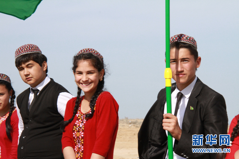 身穿紅色連衣裙的土庫曼斯坦大學生? 記者 盧敬利攝