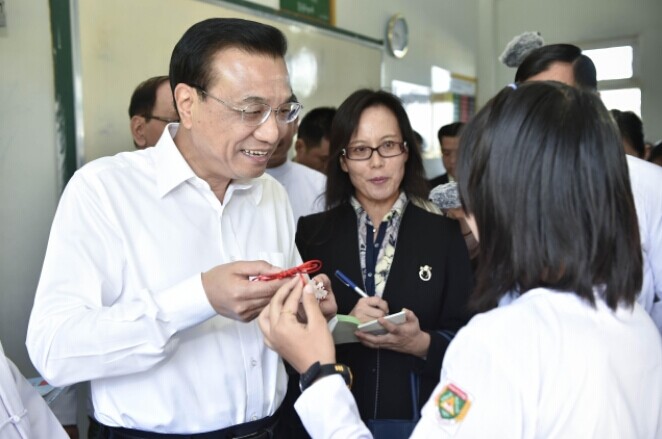14日一早,克強總理來到內比都第十四中學。這是一所普通的緬甸公立學校,課程從小學一直到高中。
