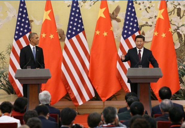 圖為11月12日,國(guó)家主席習(xí)近平在北京人民大會(huì)堂與來(lái)訪的美國(guó)總統(tǒng)奧巴馬舉行會(huì)談后,共同會(huì)見(jiàn)記者。