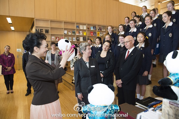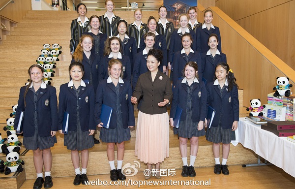 ??? 新華網北京11月19日電 據新華社“新國際”微博報道,習近平主席夫人彭麗媛19日在悉尼參觀育文武女子學校,在舞龍隊引導下來到孔子課堂。“白日依山盡……”16名女孩朗誦《登鸛雀樓》,還學打中國結、制作剪紙、繡織漢字“中澳友誼長存”。彭麗媛拿起剪刀,剪出一個“福”字。?