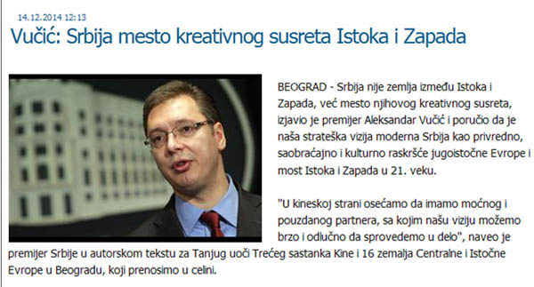 塞爾維亞總理武契奇14日在塞爾維亞南通社發(fā)表題為《塞爾維亞是東西方創(chuàng)造性相遇的地方》的署名文章。文章稱,塞爾維亞不是夾在東西方之間的國(guó)家,而是東西方創(chuàng)造性相遇的地方。他表示,一個(gè)現(xiàn)代化的塞爾維亞(應(yīng))成為東部歐洲經(jīng)濟(jì)、交通、文化的交叉點(diǎn)以及21世紀(jì)東西方的橋梁。他說(shuō),中國(guó)是強(qiáng)大的和值得信賴的伙伴,通過(guò)同中國(guó)的合作,塞爾維亞可以很快、堅(jiān)定地去實(shí)施自己的戰(zhàn)略預(yù)想。武契奇還引用《孫子兵法》作者孫武的話“如果你善于利用機(jī)會(huì),機(jī)會(huì)會(huì)增加”,表示賽爾維亞將緊緊抓住現(xiàn)在的機(jī)遇,為自己的發(fā)展創(chuàng)造新的機(jī)會(huì)。