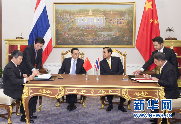 ????12月19日,國務院總理李克強在曼谷會見泰國總理巴育。這是會見后,兩國總理共同見證《中泰鐵路合作諒解備忘錄》和《中泰農產品貿易合作諒解備忘錄》的簽署。新華社記者黃敬文攝