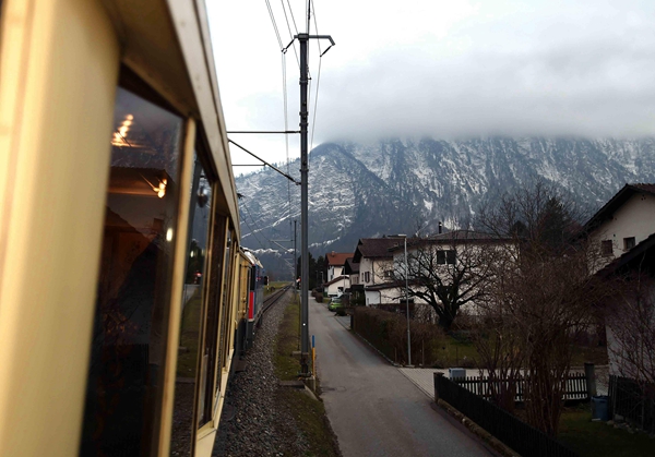(克強總理乘坐的專列駛往達沃斯,鐵路依山上行,窗外景色怡人。攝影:李濤)