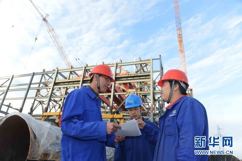 ????烏茲別克斯坦安格連(市)電廠主廠房鋼結構施工,項目經理兼項目黨支部書記楚相華(左)在與現場技術人員一起探討工程進度等情況。新華網發 記者沙達提 攝