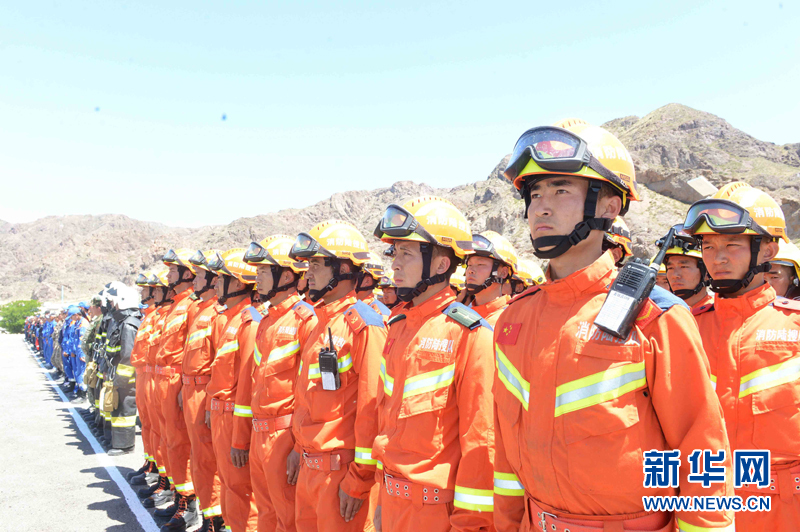 6月3日,代表中國參加上合組織國際救援聯合演練的新疆消防總隊隊員在哈薩克斯坦阿拉木圖州塔姆卡壘塔斯景區的哈內務部緊急情況委員會教練基地“巖石城-阿斯塔納”參加演練。新華社記者沙達提攝