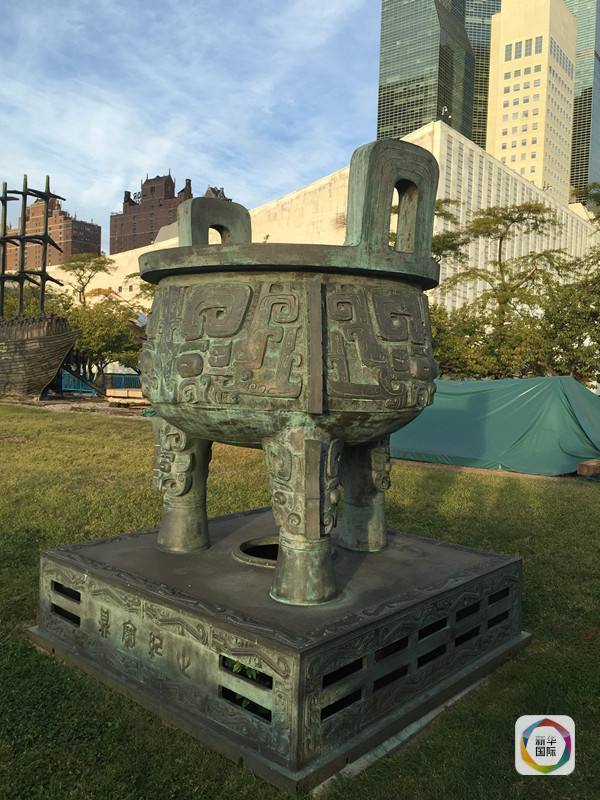 1995年10月,為紀念聯合國成立50周年,中國向聯合國紐約總部贈送了一座重約1.5噸的“世紀寶鼎”。這座鼎目前安放在聯合國大樓北花園的草坪上,鼎座高0.5米,象征聯合國成立50周年;鼎身高2.1米,象征21世紀;底座上飾56條夔龍,象征56個民族都是龍的傳人。
