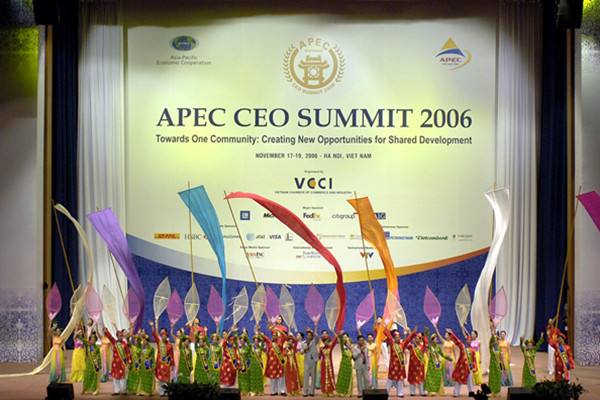 2006年11月17日,演員們在越南首都河內舉行的2006年APEC工商領導人峰會開幕式上表演。