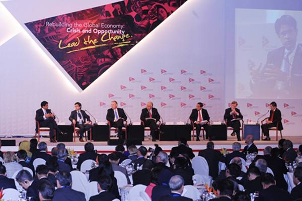 2009年11月13日,亞太經濟體領導人與亞太工商界人士在新加坡舉行的APEC工商領導人峰會上對話。