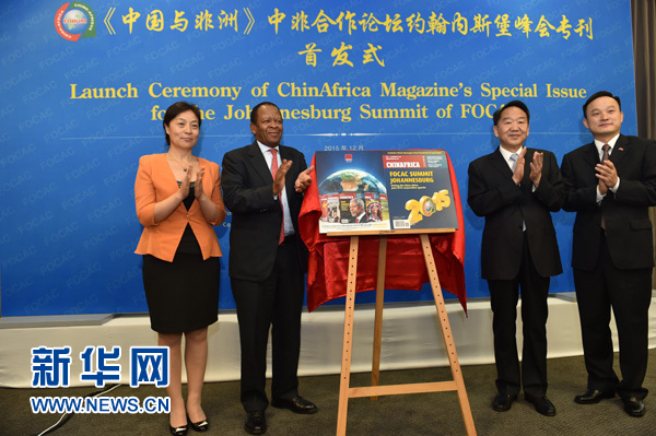 12月3日,在南非約翰內(nèi)斯堡,與會(huì)嘉賓為《中國(guó)與非洲》雜志約翰內(nèi)斯堡峰會(huì)專刊首發(fā)揭幕。新華社記者 孫瑞博攝