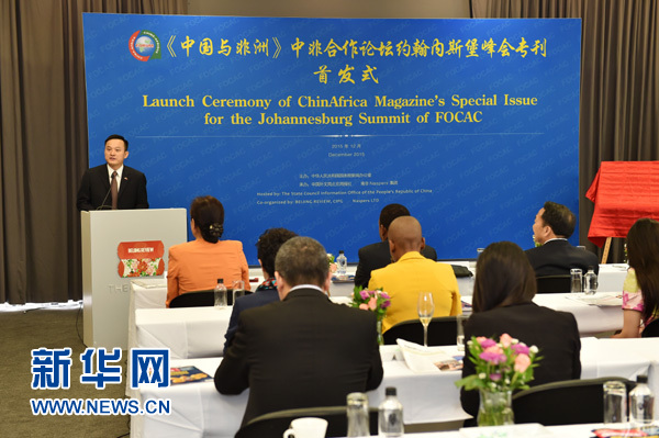 12月3日在南非約翰內(nèi)斯堡拍攝的《中國(guó)與非洲》雜志約翰內(nèi)斯堡峰會(huì)專刊首發(fā)式現(xiàn)場(chǎng)。新華社記者 孫瑞博攝
