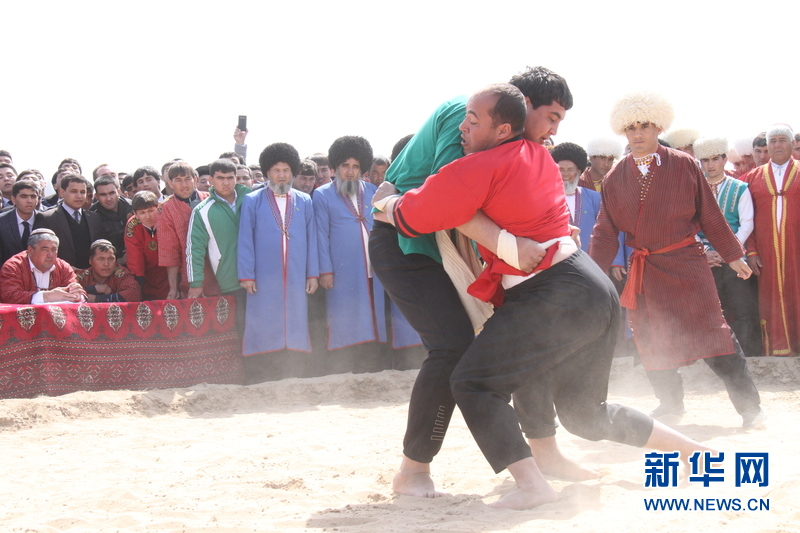 3月21日,在土庫曼斯坦首都阿什哈巴德,現場進行摔跤比賽。新華社記者盧敬利 攝