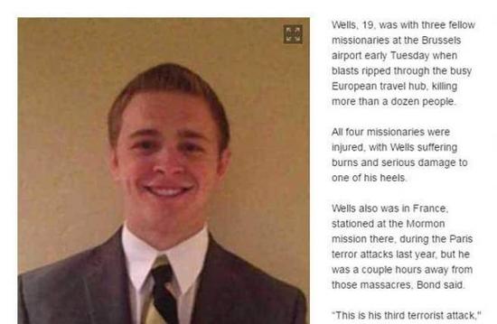 臺灣中時電子報3月23日援引《紐約每日新聞》的報道稱,19歲的美國青年威爾斯(Mason Wells)是一名傳教士,他在22日和另外三位同伴在布魯塞爾機場遇到了恐襲,所有人都受了傷,威爾斯身上除了燒燙傷外,腳也受到嚴重傷害。