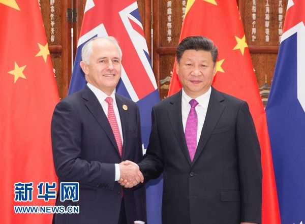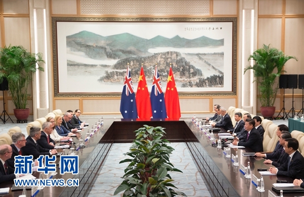 習近平指出,中方高度重視發(fā)展中澳關(guān)系。希望雙方相向而行,堅持互信互利原則,拓展務(wù)實合作,擴大人文交流,推動中澳全面戰(zhàn)略伙伴關(guān)系健康穩(wěn)定向前發(fā)展。互信是保證中澳關(guān)系順利發(fā)展的前提。中澳要尊重彼此對發(fā)展道路的選擇,尊重彼此核心利益和重大關(guān)切。我們要加強優(yōu)勢互補,繼續(xù)實施好中澳自由貿(mào)易協(xié)定,加快推進中方“一帶一路”倡議同澳方“北部大開發(fā)”計劃對接,積極拓展能源資源、農(nóng)牧業(yè)、食品加工、基礎(chǔ)設(shè)施建設(shè)等領(lǐng)域合作,更好實現(xiàn)互利雙贏。希望澳方繼續(xù)致力于為外資提供公平、透明、可預(yù)期的政策環(huán)境,這也符合澳方自身利益。要深入推進創(chuàng)新發(fā)展戰(zhàn)略對接,擴大食品、農(nóng)業(yè)、礦業(yè)、海洋科學等領(lǐng)域聯(lián)合研發(fā)。要深化教育、文化、旅游等領(lǐng)域交流,增進兩國人民相互了解和友誼。要加強反腐敗追逃追贓和反恐合作。中方愿同澳方加強在聯(lián)合國、二十國集團、亞太經(jīng)合組織、東亞峰會等機制中的協(xié)調(diào)和合作。