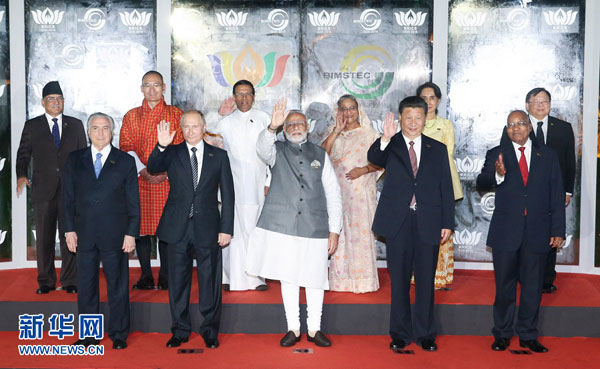 10月16日,金磚國(guó)家領(lǐng)導(dǎo)人同“環(huán)孟加拉灣多領(lǐng)域經(jīng)濟(jì)技術(shù)合作倡議”成員國(guó)領(lǐng)導(dǎo)人對(duì)話(huà)會(huì)在印度果阿舉行。國(guó)家主席習(xí)近平同印度總理莫迪、南非總統(tǒng)祖馬、巴西總統(tǒng)特梅爾、俄羅斯總統(tǒng)普京以及斯里蘭卡總統(tǒng)西里塞納、孟加拉國(guó)總理哈西娜、不丹首相托杰、尼泊爾總理普拉昌達(dá)、緬甸國(guó)務(wù)資政昂山素季、泰國(guó)政府代表等共同出席。這是與會(huì)領(lǐng)導(dǎo)人合影。新華社記者姚大偉攝