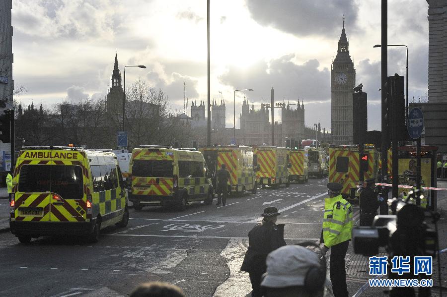??? 3月22日,救護(hù)車在英國(guó)倫敦的議會(huì)大廈外待命。 英國(guó)警方22日晚宣布,已有4人在倫敦市中心的襲擊事件中死亡,另有20多人受傷。新華社發(fā)(蒂姆·愛(ài)爾蘭攝)