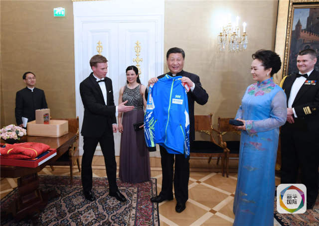 當(dāng)?shù)貢r(shí)間4月5日晚,國家主席習(xí)近平和芬蘭總統(tǒng)尼尼斯托在赫爾辛基共同會(huì)見剛剛參加完2017年世界花樣滑冰錦標(biāo)賽的中芬兩國冰雪運(yùn)動(dòng)員代表。習(xí)近平夫人彭麗媛和尼尼斯托夫人豪吉?dú)W參加會(huì)見。這是芬蘭運(yùn)動(dòng)員向習(xí)近平和夫人彭麗媛贈(zèng)送運(yùn)動(dòng)衣。新華社記者饒愛民攝