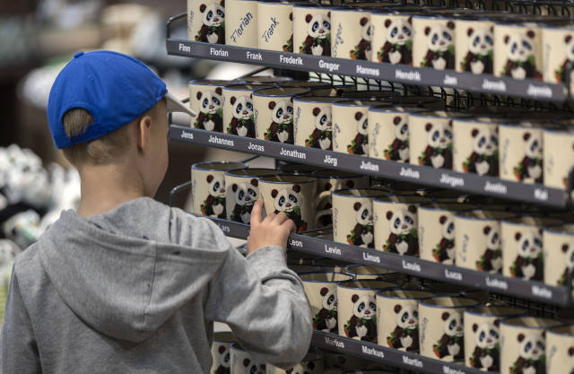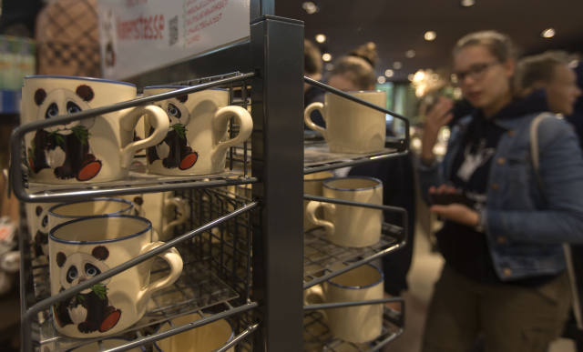 ↑7月5日,在德國柏林動物園,顧客挑選印有熊貓圖案的杯子。