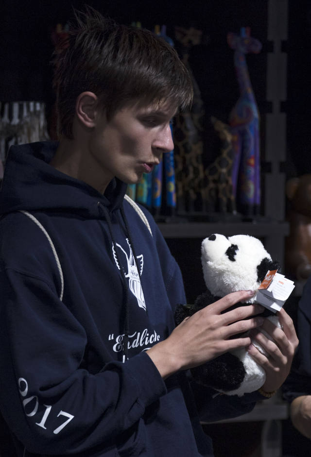 ↑7月5日,在德國柏林動物園,顧客挑選熊貓玩偶。