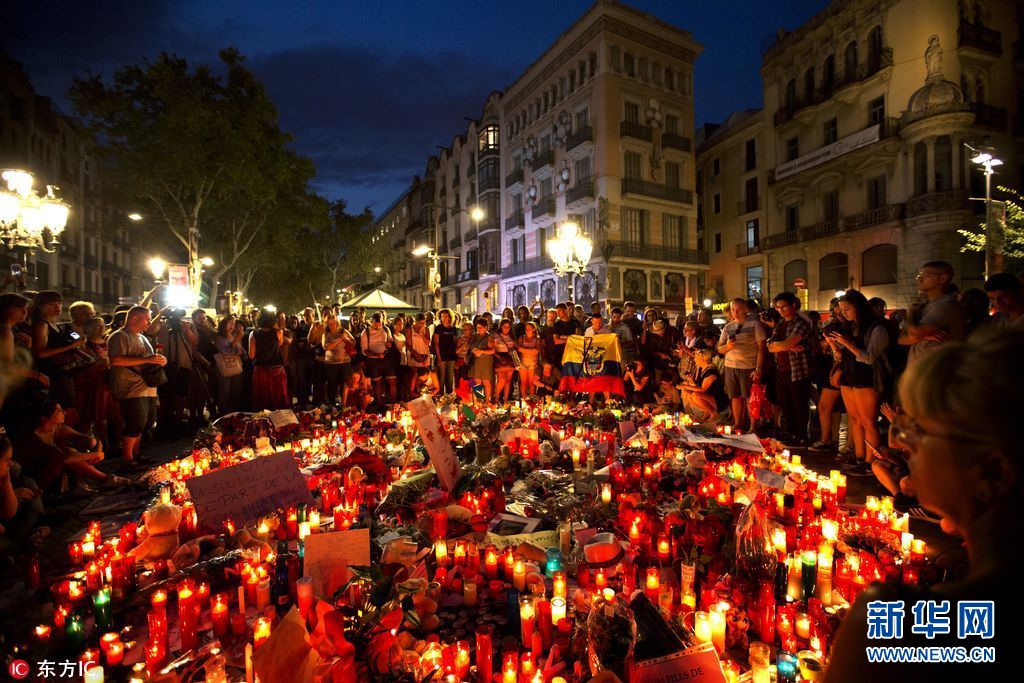 當地時間2017年8月18日,西班牙巴塞羅那,當地民眾點燭獻花悼念恐襲事件遇難者。17日,一輛白色貨車在巴塞羅那市中心蘭布拉大道加泰羅尼亞廣場附近沖撞人群,據媒體報道,死亡人數已經升至14人。(圖片來源:東方IC)