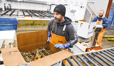 在美國緬因州波特蘭附近的海岸龍蝦公司,兩名工人正在把龍蝦裝箱。新華社發