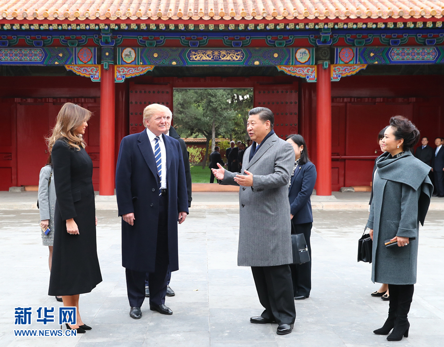 11月8日下午,國家主席習(xí)近平和夫人彭麗媛在北京故宮博物院迎接來華進(jìn)行國事訪問的美國總統(tǒng)特朗普和夫人梅拉尼婭。兩國元首夫婦在寶蘊(yùn)樓簡短茶敘。新華社記者謝環(huán)馳攝