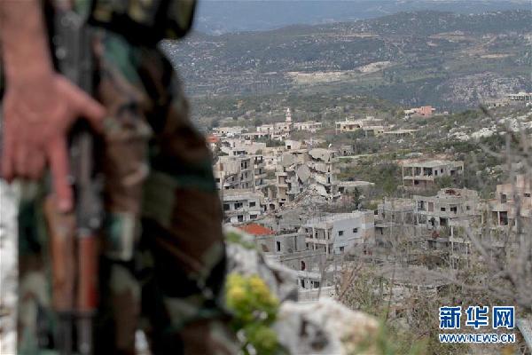 3月19日,在敘利亞拉塔基亞省北郊薩勒瑪鎮,一名敘利亞軍士兵在一處高地戒備。
