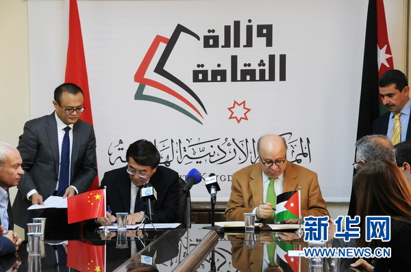 新華社安曼1月8日電(記者林曉蔚)中國駐約旦大使潘偉芳和約旦文化大臣納比·舒古姆8日在約旦首都安曼共同簽署了《中華人民共和國政府和約旦哈希姆王國政府關于在約旦設立中國文化中心的協定》。