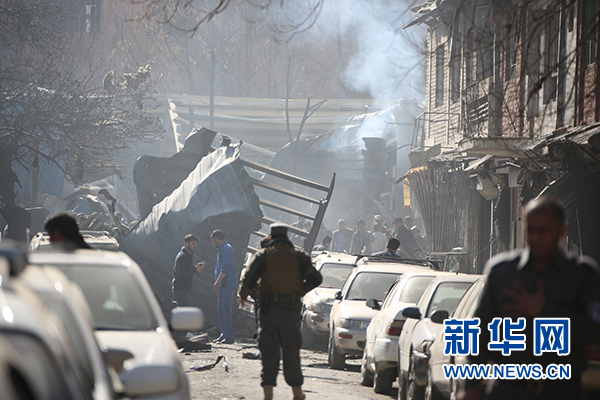 1月27日,在阿富汗首都喀布爾市中心,人們將遇難者遺體從爆炸現場抬離。新華社發(拉赫馬特 攝)  1月27日,一名安全人員在阿富汗首都喀布爾市中心的爆炸現場警戒。新華社發(拉赫馬特 攝)  1月27日,在阿富汗首都喀布爾市中心,安全人員在爆炸現場警戒。