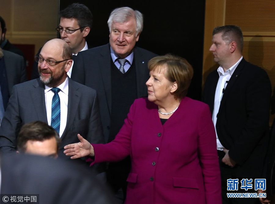2月2日,德國(guó)柏林,德國(guó)聯(lián)盟黨(由基民盟和基社盟組成)和社民黨在社民黨總部舉行會(huì)談。(圖片來(lái)源:視覺(jué)中國(guó))