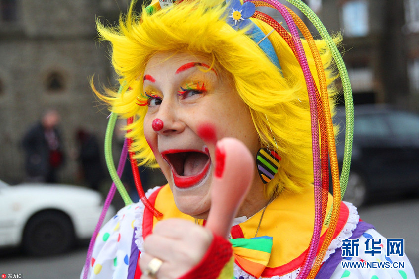 英國倫敦小丑歡聚一堂 紀念“小丑之父”