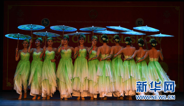 2月9日,在印度首都新德里,2018“歡樂春節(jié)”活動(dòng)演出現(xiàn)場(chǎng),中國(guó)演員在表演舞蹈。新華網(wǎng)發(fā)(張迺杰攝)