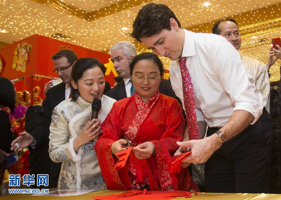 2月15日,在加拿大安大略省米西索加市,總理特魯多(右)向來自中國四川的剪紙藝人學習剪紙。加拿大總理特魯多15日來到安大略省米西索加市逛年貨大街,向當地華人華僑拜年,共慶中國狗年春節。新華社發(鄒崢攝)