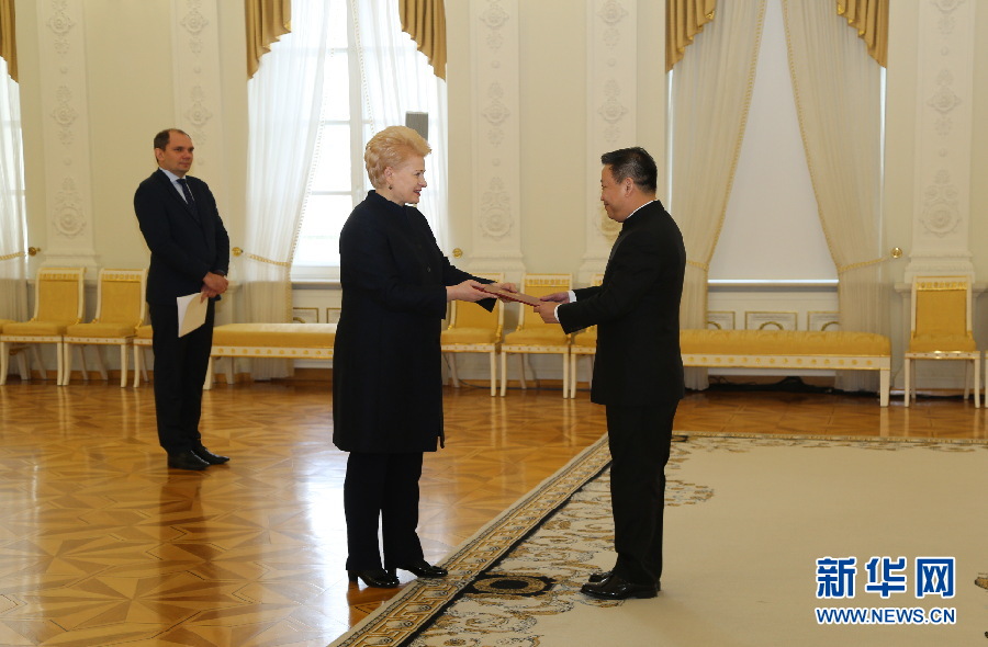 2月26日,在立陶宛首都維爾紐斯,中國駐立陶宛大使申知非向立陶宛總統(tǒng)格里包斯凱特遞交國書。新華網(wǎng)發(fā) 郭明芳攝