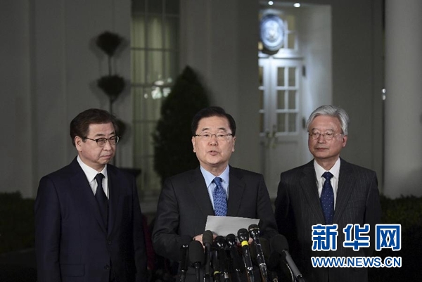 3月8日,正在美國訪問的韓國青瓦臺國家安保室室長鄭義溶(中)在華盛頓白宮說,朝鮮最高領導人金正恩委托韓方向美方轉達他希望盡快與美國總統特朗普會面的意愿,特朗普已經同意在5月之前與金正恩會面。新華社/美聯