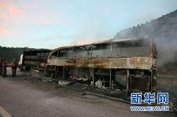 據當地媒體報道,一輛從伊斯坦布爾開往北部城市托卡特的夜間長途大巴,在當地時間早晨6時左右途經喬魯姆省時,追尾一輛停在路邊的半掛式卡車,大巴車車頭變形并起火燃燒。