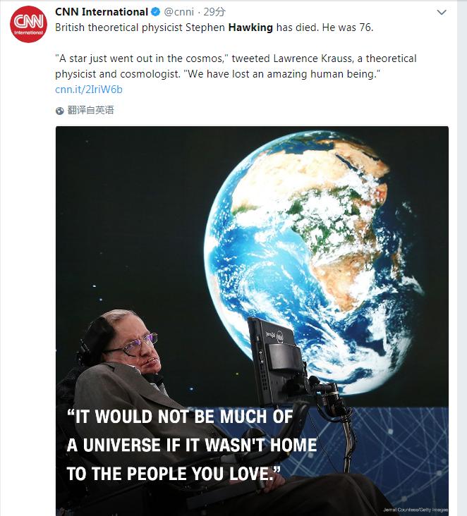 美國有線電視新聞網(wǎng)(CNN)引用理論物理學家、宇宙學家Lawrence Krauss的推特說:“一顆星剛剛在宇宙中熄滅,我們失去了一位了不起的人”。