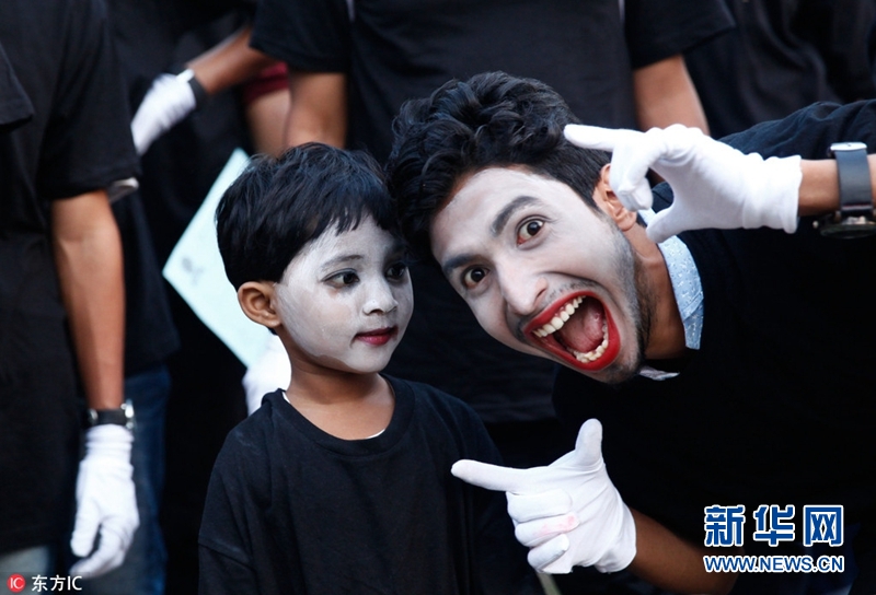 當地時間2018年4月8日,孟加拉國達卡,2018年國際啞劇節在達卡開幕,超過254名啞劇演員齊聚達卡大學參加表演,成為全世界啞劇演員最多的表演節目,破吉尼斯世界紀錄。(圖片來源:東方IC)
