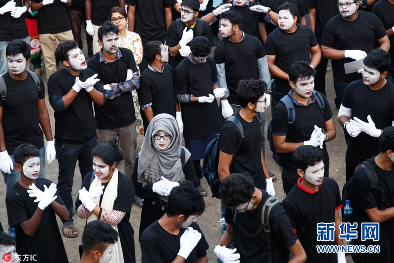 當(dāng)?shù)貢r(shí)間2018年4月8日,孟加拉國達(dá)卡,2018年國際啞劇節(jié)在達(dá)卡開幕,超過254名啞劇演員齊聚達(dá)卡大學(xué)參加表演,成為全世界啞劇演員最多的表演節(jié)目,破吉尼斯世界紀(jì)錄。(圖片來源:東方IC)