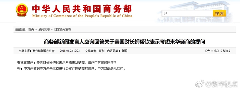 新華網(wǎng)北京4月22日電? 商務部網(wǎng)站消息,有媒體提問:美國財長姆努欽表示考慮來華磋商,請問中方有何回應?答:中方已收到美方希來北京進行經(jīng)貿(mào)問題磋商的信息,中方對此表示歡迎。 ????(據(jù)新華社“新華視點”微博報道)