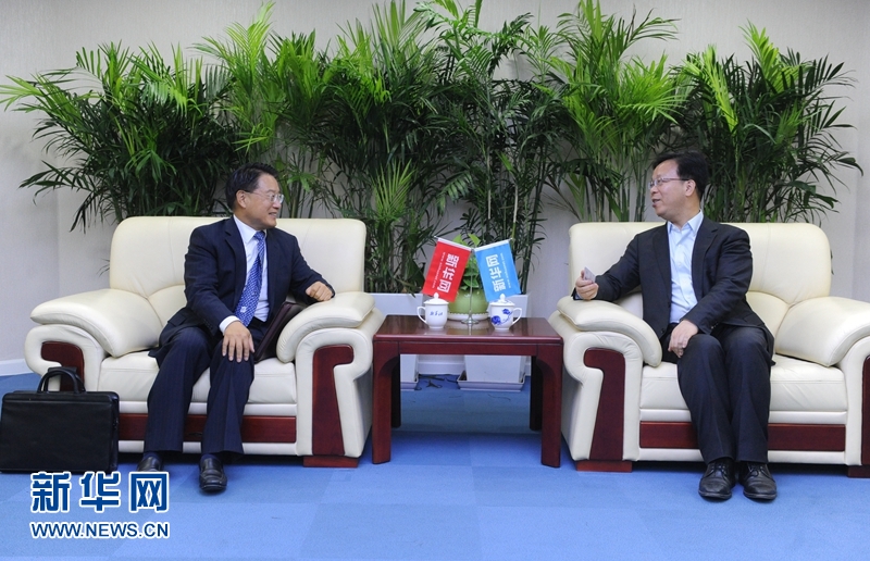 4月24日,聯合國工業發展組織總干事李勇(左)在北京接受了新華網獨家專訪。圖為新華網黨委常委、副總編輯劉加文在訪談前會見李勇。新華網記者 陳競超攝
